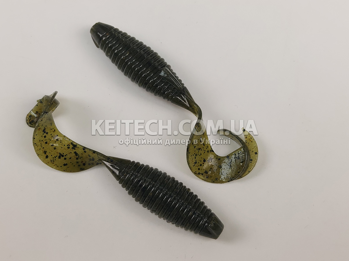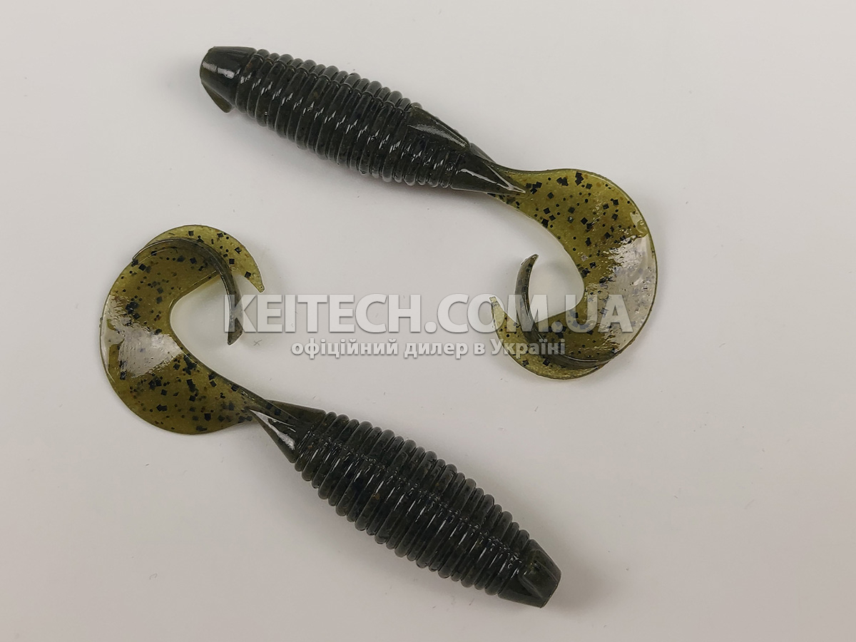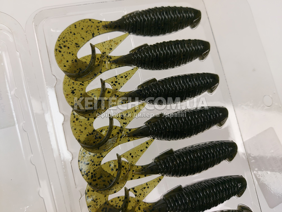 ДокладнішеСилікон Keitech Flapper Grub – перший класичний твістер, випущений під торговою маркою Keitech. Але навіть і тут японці привнесли кілька своїх родзинок у здавалося б звичну всім приманку. Його закручений хвіст оснащений лопатою, яка дозволяє силікону вмикатися в роботу на мінімальних швидкостях проводки. Це дає деякі переваги при лові пасивної риби, не готової ганятися за здобиччю. Тіло твістера трохи плескато у верхній частині, що дозволяє ідеально підібрати для нього офсетний гачок, жало якого буде лежати на поверхні і при першій же можливості встромиться в пащу риби. Для того, щоб гачок краще тримався в тілі приманки, передбачені спеціальні виступи в місцях входу та виходу дроту офсетника, завдяки яким значно триватиме термін служби приманки і вона не почне раніше сповзати з гачка. Також цей твістер легко можна оснастити двійником або класичною джиг-головкою, що робить його універсальним для будь-яких умов лову.
