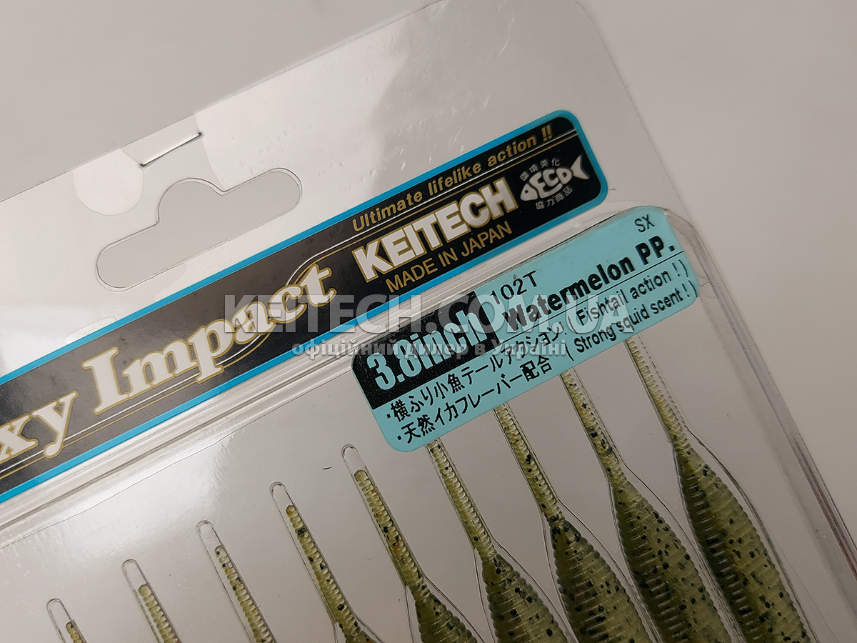 Тіло приманки зроблено з двох видів силікону для кращого балансу – зверху легший (без солі), знизу – важчий (з сіллю). Sexy Impact – підходить для безлічі різних оснасток та проводок. Принада відмінно поводить себе на ривковій проводці з успіхом імітуючи малька, що мечається. Також можна використовувати Sexy Impact на звичайній джиг головці, дроп-шоті, спліт-шоті, техаському оснащенні.